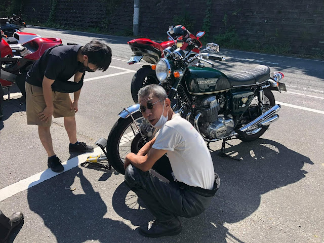 上の画像は、その組付けたキャブレターのテストで通称、点滴タンク?のガソリンを流し込んで「エンジンがちゃんとかかるか!?」の段階。
