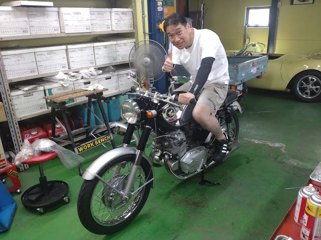 「オッ!いよいよ完成やねぇ!」とCBに跨ってもらった